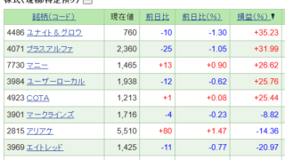 パフォーマンス推移前月比(%)前年比(%)PF-0.9%-4.7日経平均+0.17+26.18グロース250-3.48+4.82グロースに10%程度劣後か。投資比率銘柄(コード)比率7730 マニー40.40%4923 COTA15.40%...