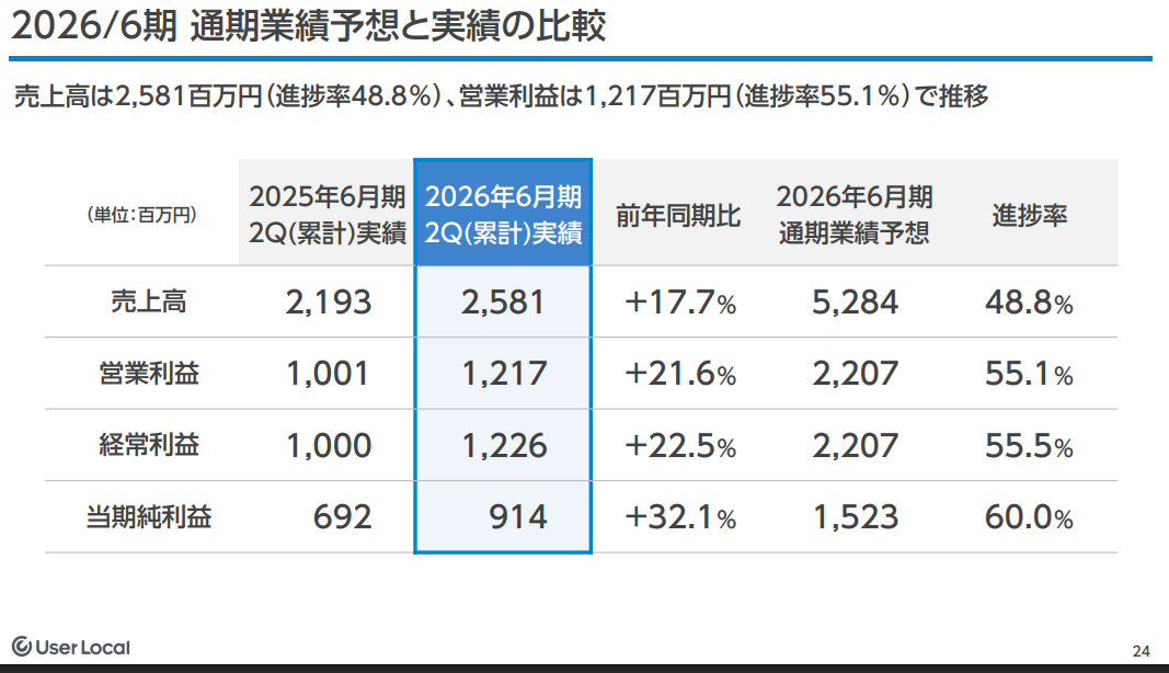 ユーザーローカル:2026年6月期第2四半期決算